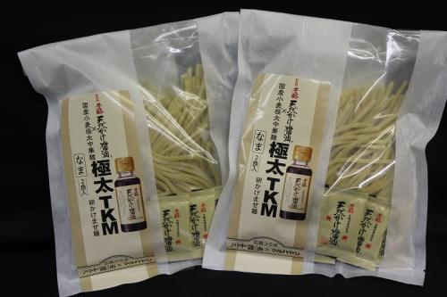 極太T(卵)K(かけ)M(麺)とは、麺に卵をかき混ぜるだけで完成する中華麺です。国産小麦を100%使用したコシの強い特製極太麺です。卵を割り入れ、川中醤油の「芳醇 天然かけ醤油」をひとかけすると、麺の甘み、卵の濃厚さ、かけ醤油の旨味が重なり、噛めば噛むほど深い味を堪能できる商品です。初めて極太TKMを試したい方におすすめです。※卵は別途ご準備ください。