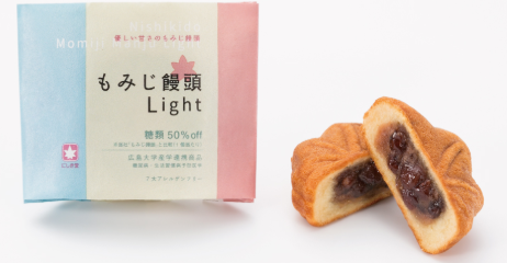 にしき堂の「もみじ饅頭Light(ライト)」は、たくさんの方々に美味しく食べていただきたい、という思いから生まれました。糖類を控えた優しい甘さで8大アレルゲンにも対応しております。広島大学と連携して糖類を控えたお菓子づくりに挑戦することで糖類の使用量を50%削減することに成功しました。生地は、小麦粉や卵の代わりに豆乳、米粉、食物繊維を使用し、砂糖の使用量を控える代わりに糖アルコールや還元水飴を使用することで、しっとりとした中にもちもち感のある仕上がりになりました。餡は、北海道の高品質な小豆を使用し、小豆本来の風味が味わえる粒あんとしました。